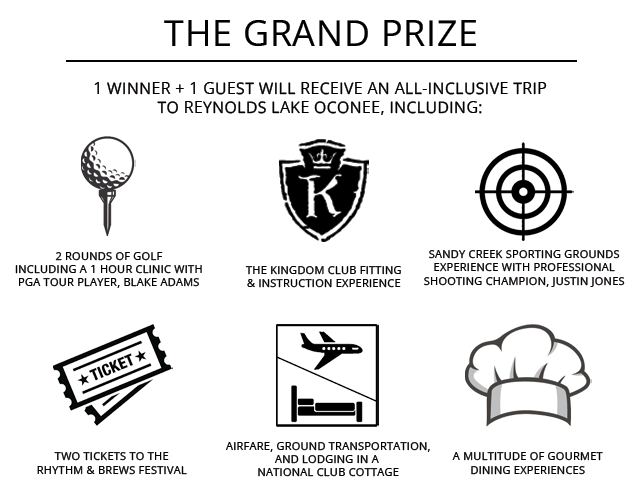 The grand prize includes an all-inclusive trip to Reynolds Lake Oconee, a world-renowned community tucked into the rolling lake country of Georgia, about 85 miles east of Atlanta. Set along the shores of Lake Oconee, Reynolds features seven carefully crafted golf courses surrounded by unmatched amenities and Southern hospitality.